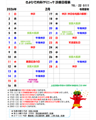 令和7年1月、2月 診療日程について Posted on 03/29/202512/26/2025 by きよひで内科クリニック管理者_01 令和7年1月、2月の診療日程は下記のとおりです。 ☆ 8時30分診療開始となります(玄関も 8時30分解放です)。 ☆ 毎週木曜日は宮医大医師の診療となります。