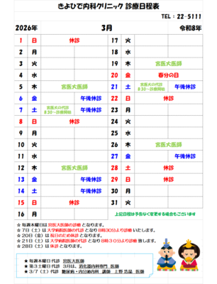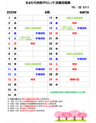 令和7年3月、4月の診療日程は下記のとおりです。